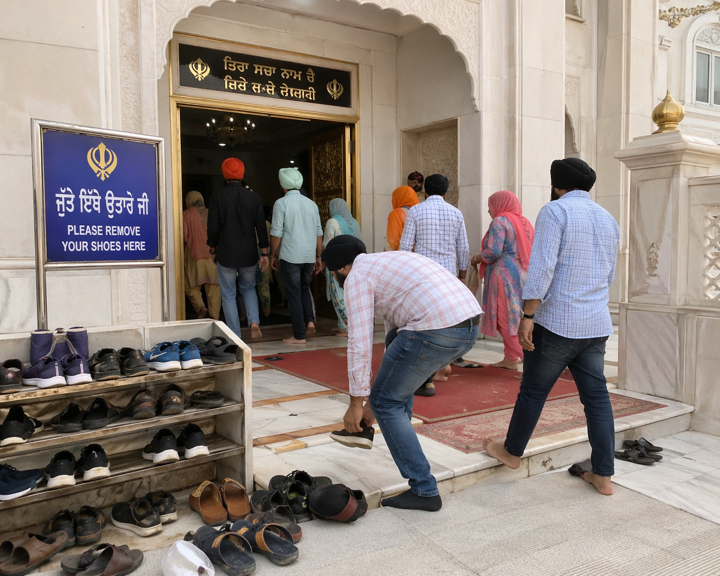 Inside the Darbar Sahib (main hall): Walk in calmly and bow toward the Guru Granth Sahib if you wish (it's respectful but not required). Sit on the floor with your feet tucked away from the Guru Granth Sahib - pointing your feet toward it is considered disrespectful. Avoid turning your back to the Guru Granth Sahib when possible.